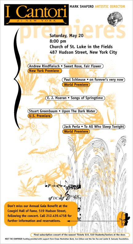 Designs for two postcards in a series of promotional mailers announcing upcoming events for this chamber choir specializing in contemporary music.