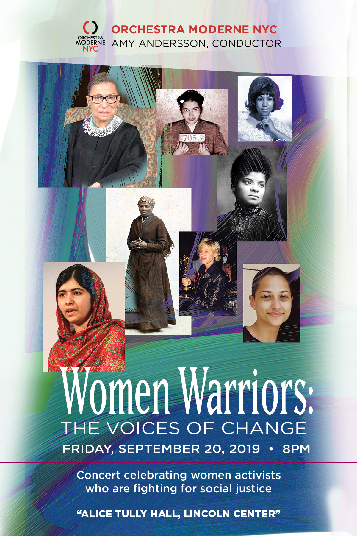Promotional posters and branding featured on an innovative video backdrop played during the concert, for an orchestral program at Liincoln Center on the theme of women’s history and featuring newly-commissioned pieces by female composers.